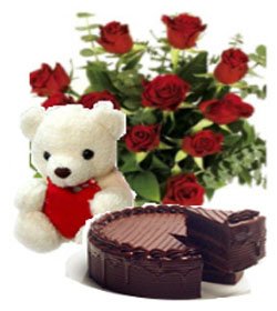 A beautiful way to let your spouse/ sweetheart/ loved one know how much she's missed. 12 Pieces red roses bouquet, 8 inches white teddy w/ iloveyou pillow and chocolate cake.Your gift will come with a greeting card