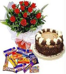 A perfect combinationSweet, romantic, and thoughtful.a choclate basket (8 items consist), a dozen bunch of roses and a cake represents the three. |