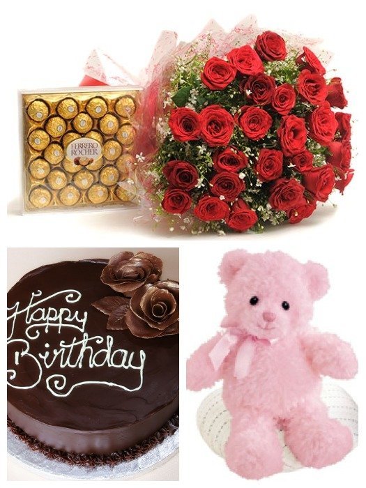 Cake - Chocolate, 2 ft teddy , 24 roses & ferrero