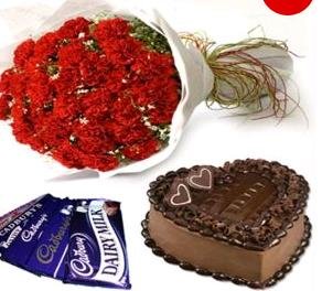 Red Roses With Chocolate And Cakesend your feelings, emotions, care, love to your dear one with this beautiful bunch of flowers, cake and Rose, by sending these amazing flowers, cake and chocolate, 12 red roses bunch and 1/2 kg. black forest cake,With 4 mix cad bury chocolate 40 grm each. |