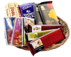 Chocolate Hamper - 8Cadbury Bars - 3 Nos ,65 gm each Vochelle Choco Bars - 3 Nos ,40 gm each Cadbury Bournville Bars - 2 Nos Cadbury DairyMilk Silk Big Bar - 1 No ToblerOne Chocolate - 300 gms |