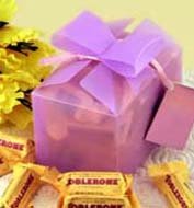 Toblerone box-2Gift Shop Cafe exclusive 25 pieces Toblerone Chocolate Mini bars, in a Lavender Reuseable Polypro Gift Box. Net weight is 12.7oz or 360g. |