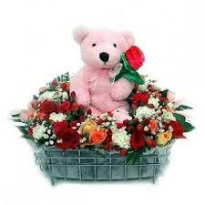 MISS U 2Basket Arrangement of 24 mix colour roses with 9" teddy bear |