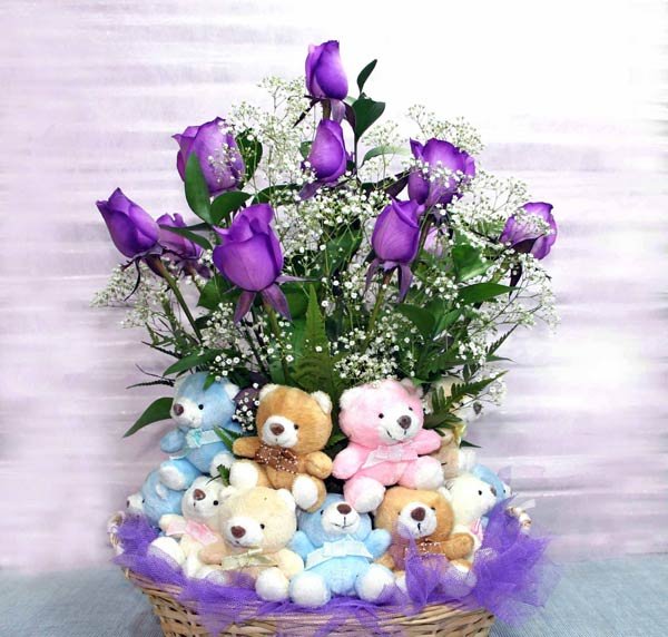 Purple In a Basket12 Purple Roses With 8 Mixed Color small Bears In a Basket |