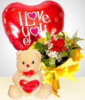 6 Roses Bouquet + Balloon + Teddy Bear "To say "Sorry," I love you "or just" I'm with you ". Super romantic offer of: -6 roses bouquet -A I LOVE YOU balloon 24 inches teddy and PIlLow -A teddy bear specially for the occasion.