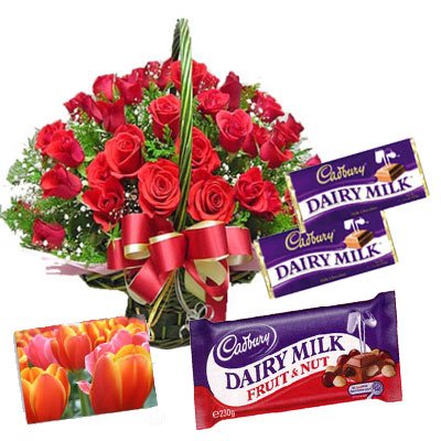 The Queen of HeartsSend 24 Red Roses Basket, 1cadbury milk 165 g 2 Cadbury Fruit & Nut (65 rgm each) with a Free Greeting valentines Card with your message |
