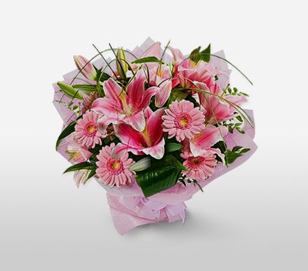 Indulgent OpulenceA brilliant creation of style and elegance is presented through this pink gerberas and pink lilies, surrounded with greens and tied in fancy wrapping paper with a bow. |