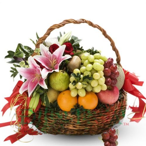 Oranges, apples and bananas complete this basket of flowers with the juicy, citrus sweetness they bring out. Fruits Arrangement (6 item) and stargaizer,gerbera in a basket.