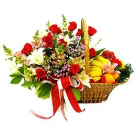 Oranges, apples and bananas complete this basket of flowers with the juicy, citrus sweetness they bring out. Fruits Arrangement (6 item) & 6 red roses and stargaizer in a basket.