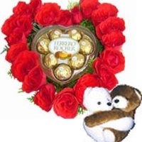 Love Of My Life...A teddyfic gift like 24 red roses in a basket with heart shape ferrero chocolate and couple bear to make your honey feel special... |