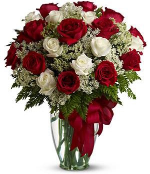 Lassie13 red roses, 8 white roses, match greenery and white flowers, arrange in a glass vase, red bowknot. (The picture is only for reference and the main items are the same and vase may vary for areas, the effect is guaranteed.) |