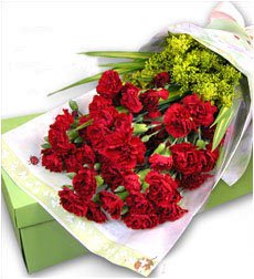 MothersLoveDescription 24 Red carnations Goldenrod flowers (Solidago) to decorate Large green leaves to fill the bouquet |