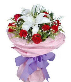 My Angel2 white lily,11 red rose. Pink hands knead paper packaging, the external screen, pink, purple butterfly finished bouquet. |