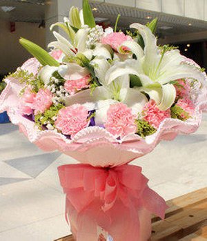 Pink Carnations with stargaizerPink Carnations, 3 white Lilies, full with gypsophila paniculata. |