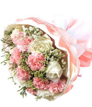 Thousands of WordsSeven white roses, 12 stems pink carnations with white small floral and green stuff deocrated. Pink paper and blue ribbon tied hand bouqet. |