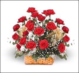 Beautifully arranged 24 pieces red roses in a fashioned basket - long lasting beauty !
